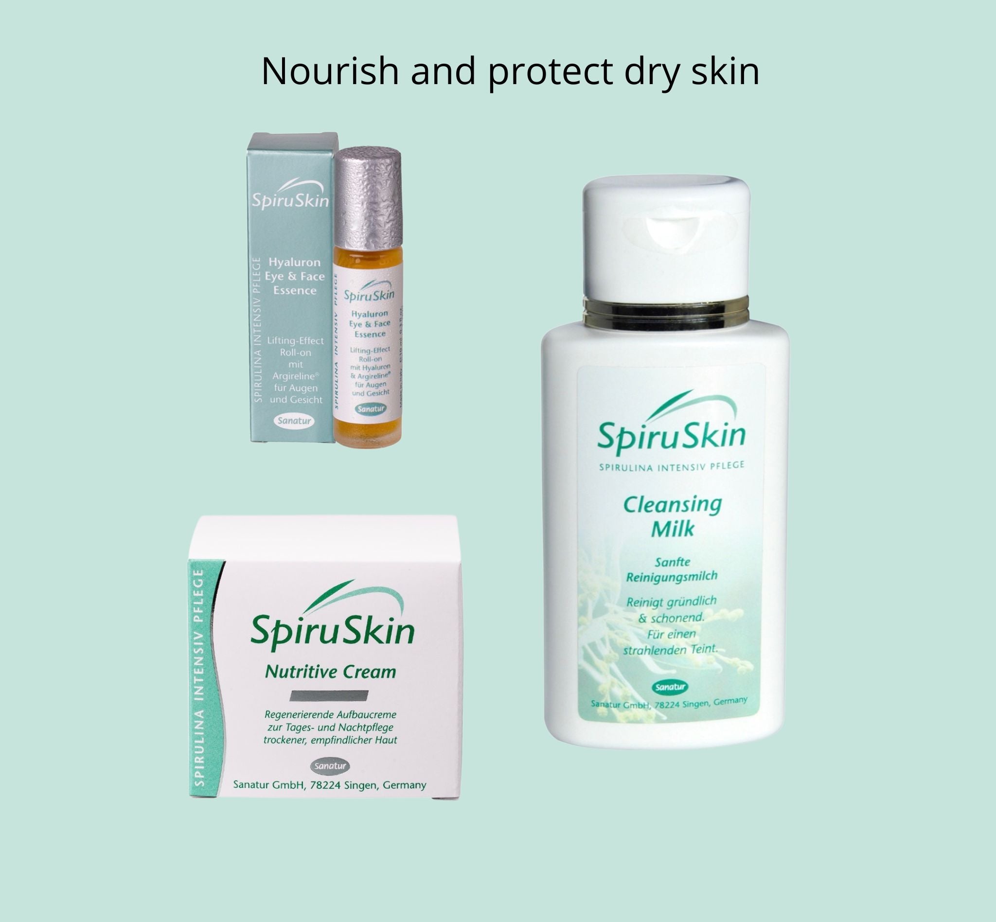 Deep hydration restores lost moisture, smooths texture, eliminates flaking, and soothes discomfort. Intensely moisturizing serums with hyaluronic acid, such as SpiruSkin Eye & Face Essence with its convenient roller applicator, are especially beneficial for dry skin. Apply the serum to cleansed skin before your cream to enhance radiance.