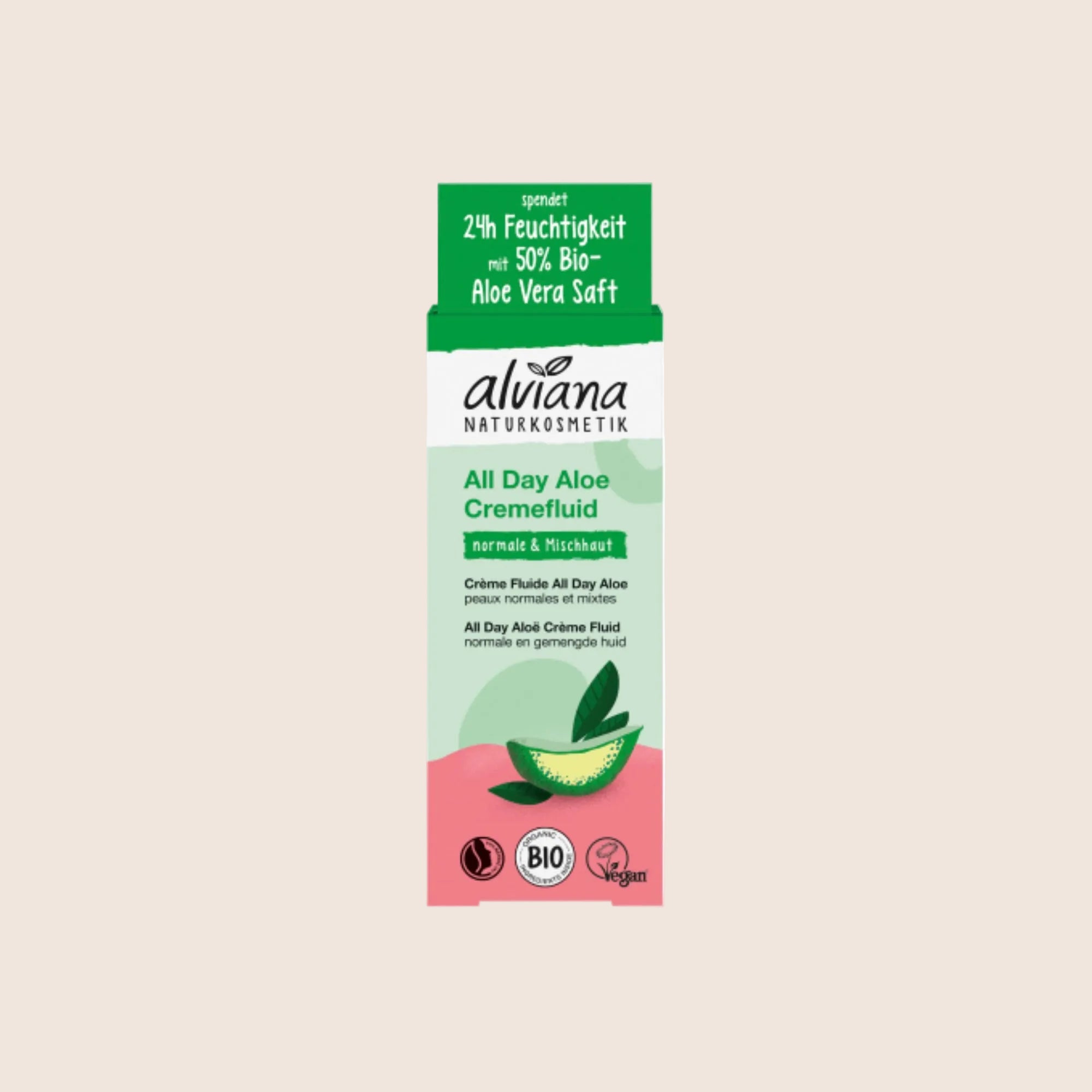 Light and refreshing, ALVIANA ALL DAY ALOE CREAM FLUID deeply hydrates normal and combination skin with the power of organic aloe vera juice.