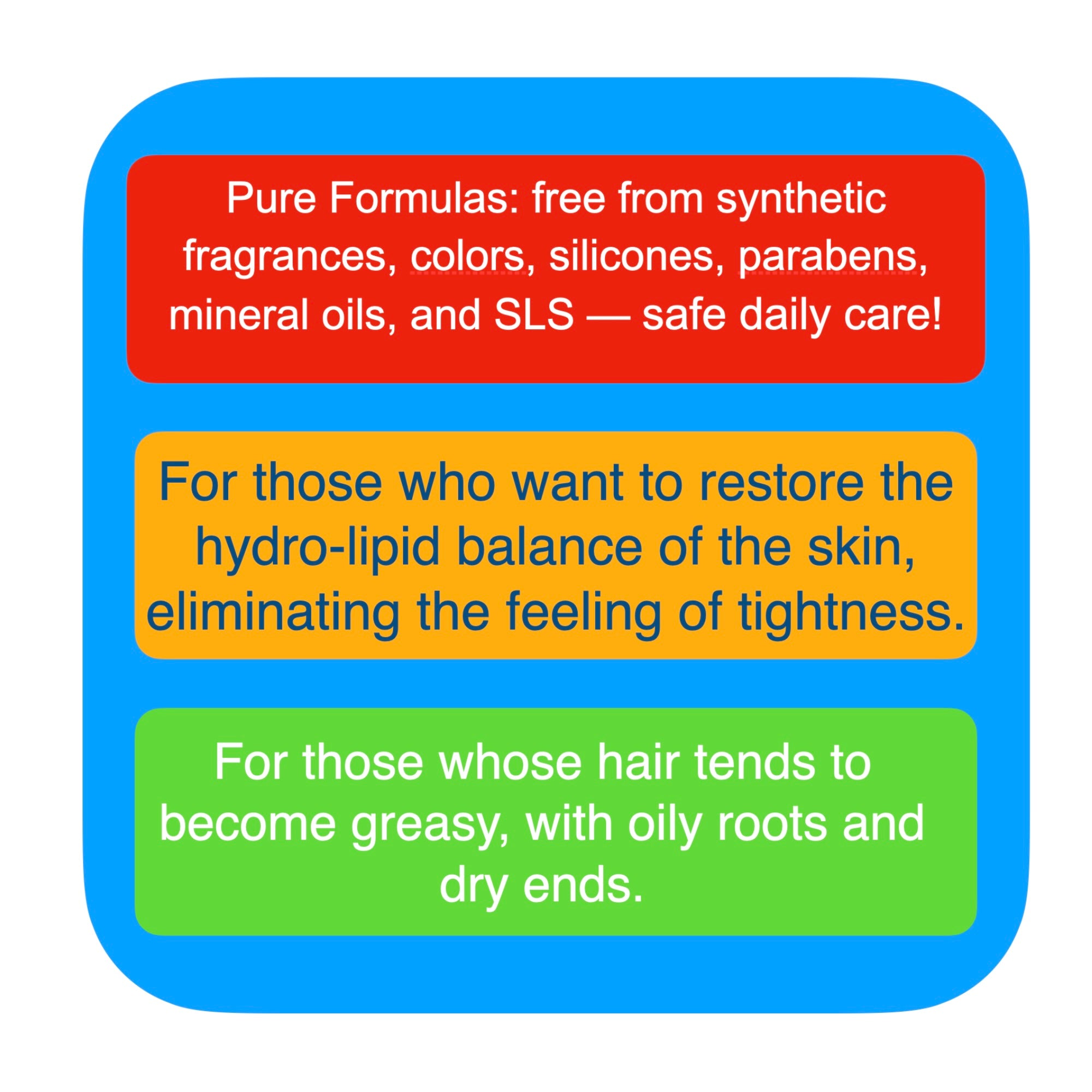 · Pure Formulas: free from synthetic fragrances, colours, silicones, parabens, mineral oils, silicones and the SLS: safe daily care!