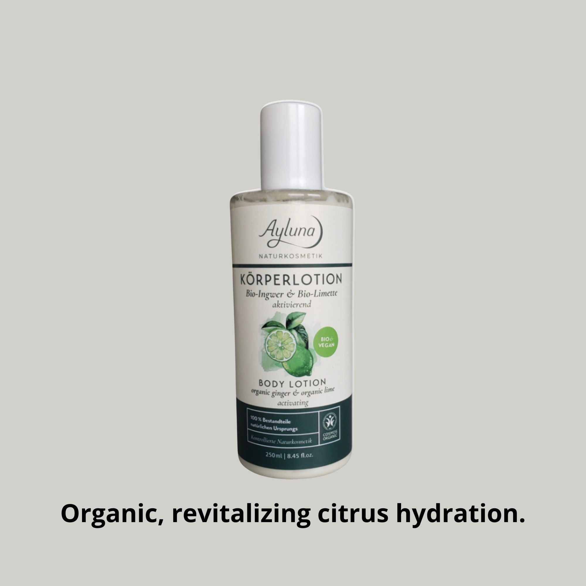 Bio Ginger & Lime Lotion. 250ml. 100% Natural. Vegan & Halal. Fast-absorbing, moisturizing & revitalizing organic care.