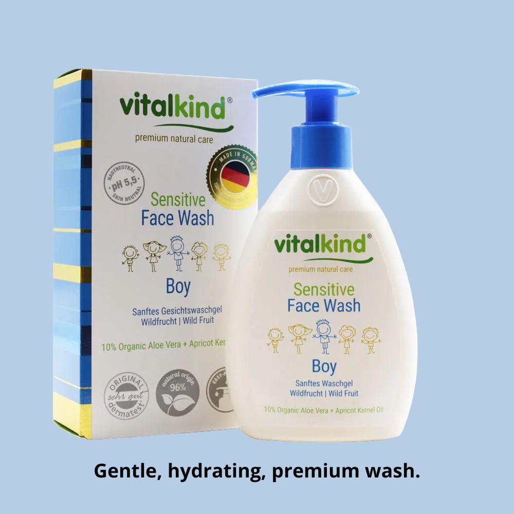 The mild formula of the Boy Face Wash Sensitive in a convenient dispenser with a pump has been specially developed for daily gentle facial cleansing, is suitable for sensitive skin. The pH value of 5.5 maintains the skin’s natural acidic mantle - an essential factor in protecting the skin from the harmful environmental influences, including bacteria and pollution. Organic aloe vera provides long-lasting hydration. The valuable apricot kernel oil protects the skin from drying out. The cheeky wild fruit scent is a hit with boys and makes daily care an exciting experience.